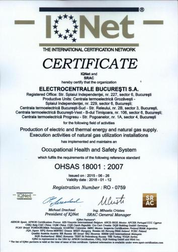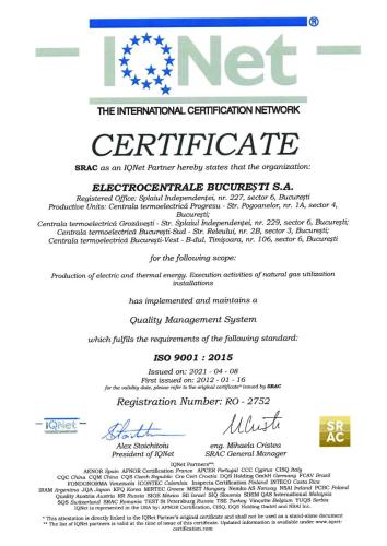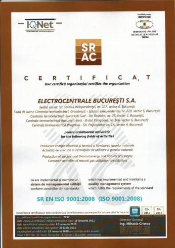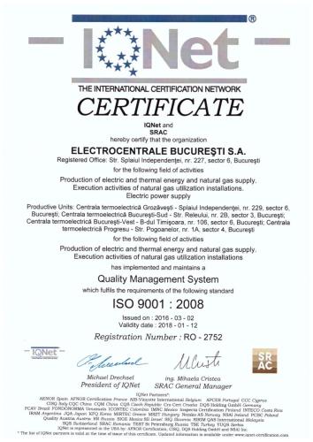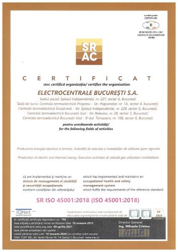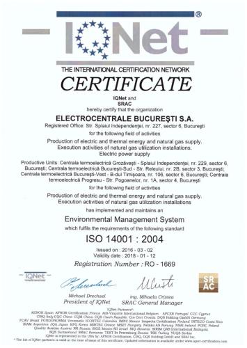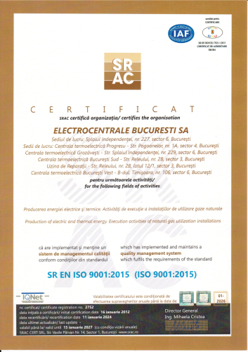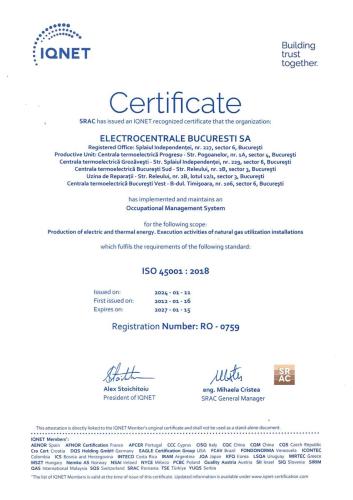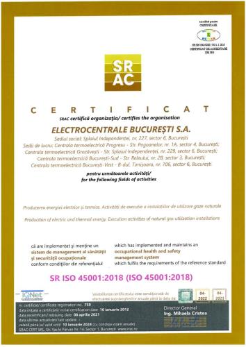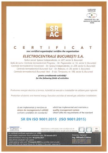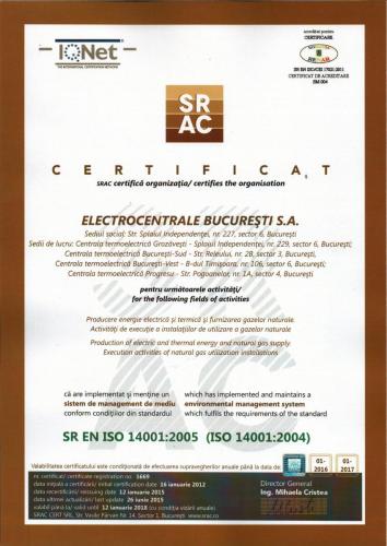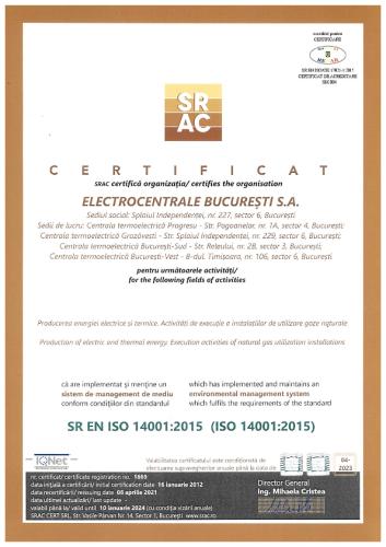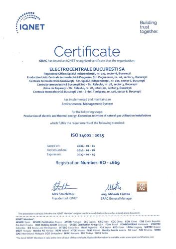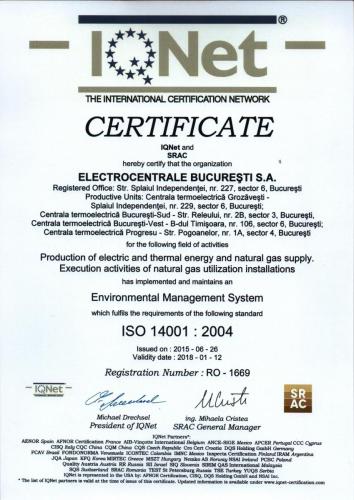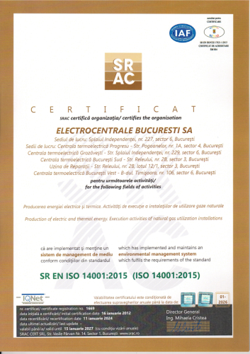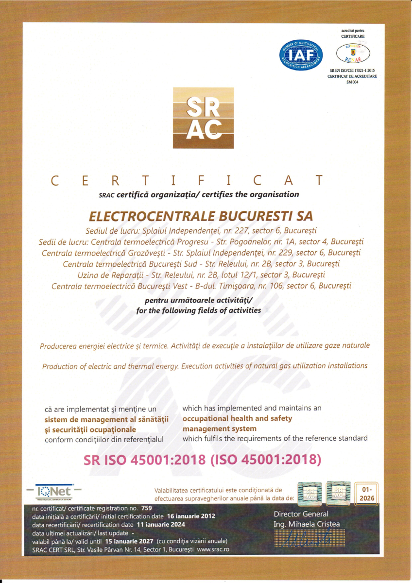 Pentru îndeplinirea necesităţilor şi aşteptărilor clienţilor săi şi ale altor părţi interesate, precum şi a cerinţelor legale şi de reglementare, conducerea Electrocentrale Bucureşti S.A. acţionează pentru menţinerea Sistemului de Management Integrat Calitate — Mediu — Sănătate şi Securitate în Muncă şi îmbunătăţirea continuă a eficacităţii acestuia, în conformitate cu cerinţele standardelor SR EN ISO 9001:2015, SR EN ISO 14001:2015, SR EN ISO 45001:2023.